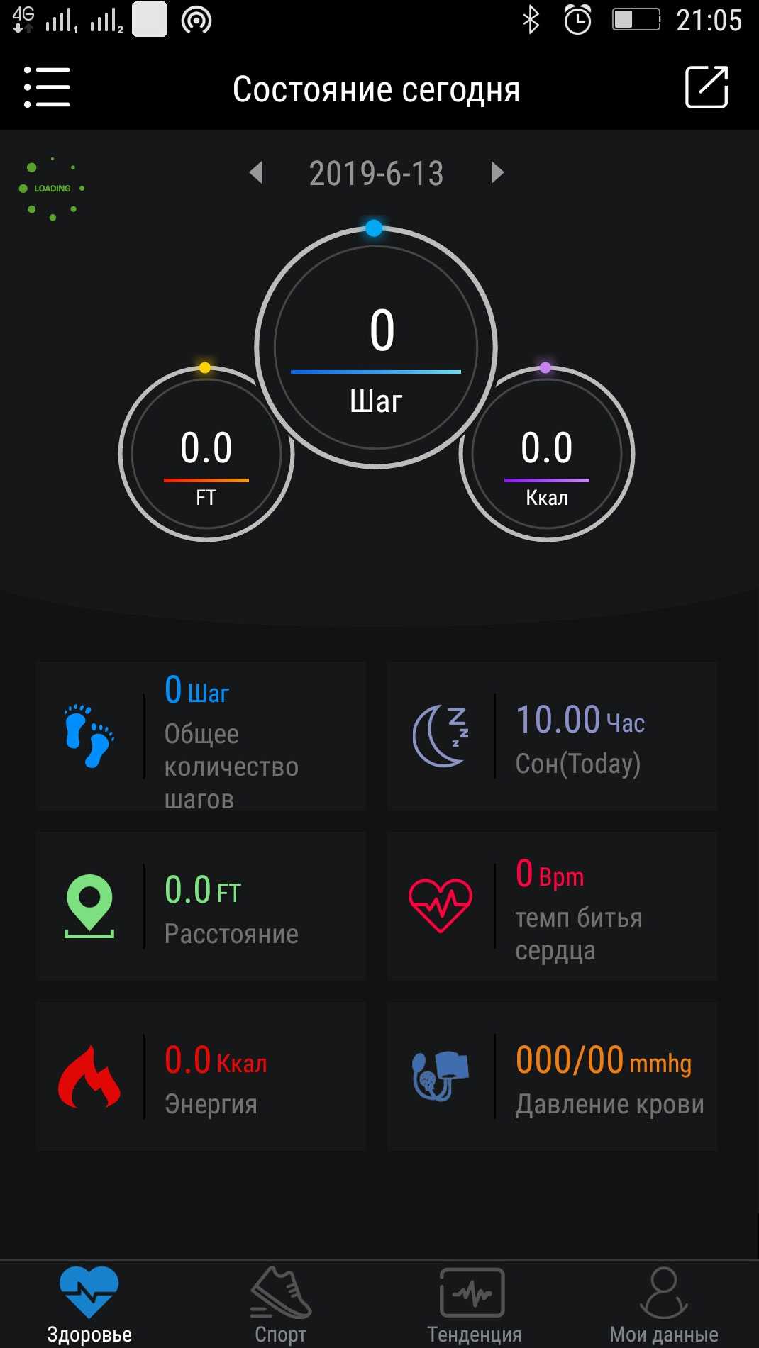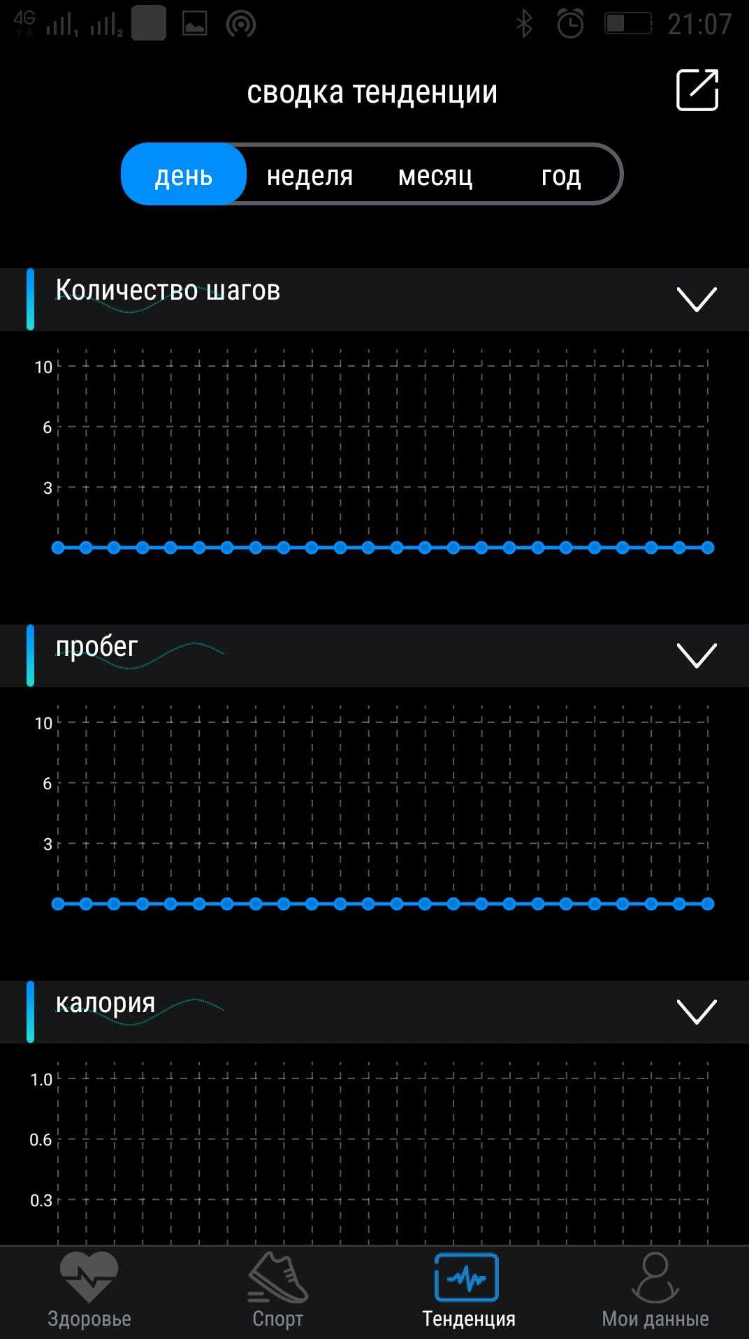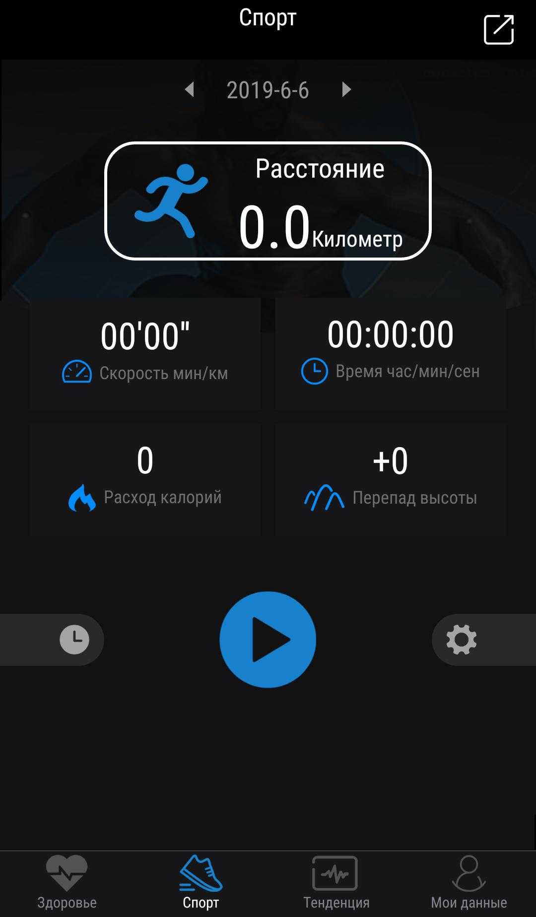 На главном экране указано количество шагов за текущий день, расстояние, потраченные калории и другие сведения.
