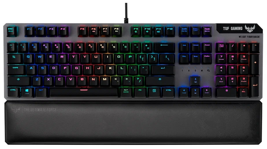 Еще вы будете приятно удивлены наличием кириллической раскладки, которая уже нанесена на клавиши и подсвечивается. При этом подсветка кириллицы выглядит слегка тускло на фоне латинского алфавита. Корпус ASUS TUF Gaming K7 Linear switch защищен от влаги и пыли, поэтому даже случайно пролитый чай или кофе не нанесет серьезного ущерба девайсу. Предусмотрена съемная подставка под запястья, выполненная из эластичного полиуретана. Общее количество клавиш с ходом 3 мм составляет 104 штуки.