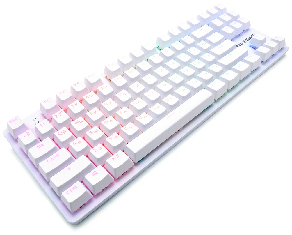 В ходе совместной работы с брендом Dark Project компания Red Square презентовала новые PBT-кейкапы, в которых латинские и кириллические символы имеют равномерную подсветку. Сами кейкапы выполнены с применением технологии double shot, которая подразумевает спрессовывание двух типов пластика, один из которых пропускает свет. В результате символы на кейкапах являются частью колпачка, поэтому стереть их практически нереально. Толщина стенок равна 1,1 мм, а профиль кейкапов напоминает ОЕМ, но находится чуть ниже. Компания приложила максимум усилий, чтобы угодить клиентам, поэтому снизила уровень шума при нажатиях, предусмотрев специальный шумоизоляционный материал под пробелом. Стабилизаторы обильно смазаны, поэтому не издают скрипов и других раздражающих звуков. В Red Square Keyrox TKL используется приятная разноцветная подсветка, отображающая широкую палитру цветов и оттенков. Вы можете менять яркость и скорость подсветки, используя специальные комбинации. При этом вам не потребуется загружать специальный софт. При зажатии клавиши Fn функциональные кнопки подсвечиваются.