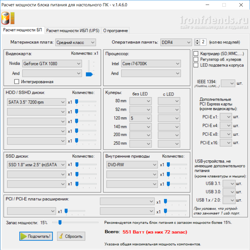 На первой вкладке вводятся параметры системного блока и рассчитывается необходимая мощность блока питания.