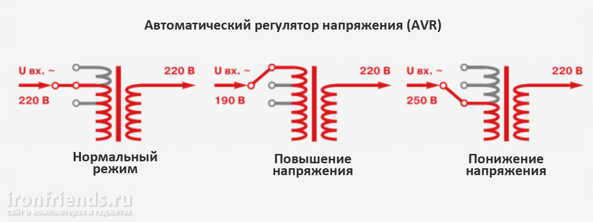 Такие ИБП при падении напряжения ниже 190 В или повышения выше 250 В выравнивают его до уровня около 220 В на выходе.