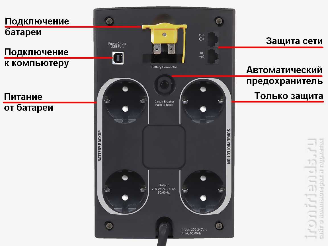 Кроме этого, в ИБП могут быть разъемы RJ45 для защиты от пробоев через кабель интернета и RJ11 для защиты телефонной линии, включая DSL-модем.