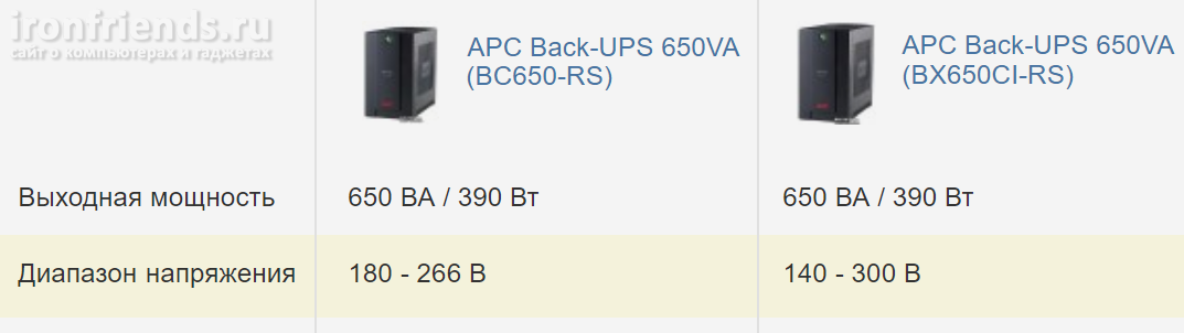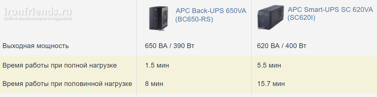 Выходная мощность ИБП часто указывается в вольт-амперах (ВА) и отражается в маркировке. При этом мощность компьютера (включая монитор) в ваттах (Вт), на которую рассчитан ИБП, значительно меньше, что также указывается в параметрах конкретной модели.