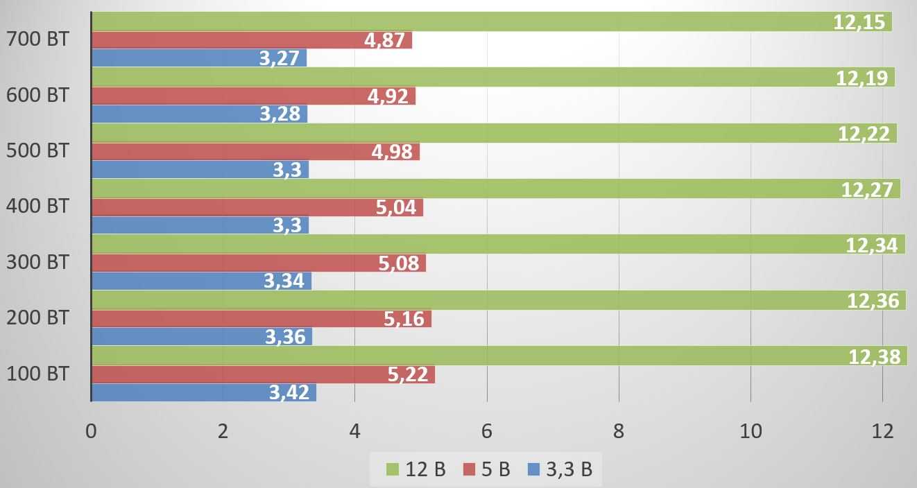 По требованиям стандарта ATX отклонение не должно превышать 5%. Таким образом, норма для линии +12 В лежит в пределах 11.4-12.6 В.