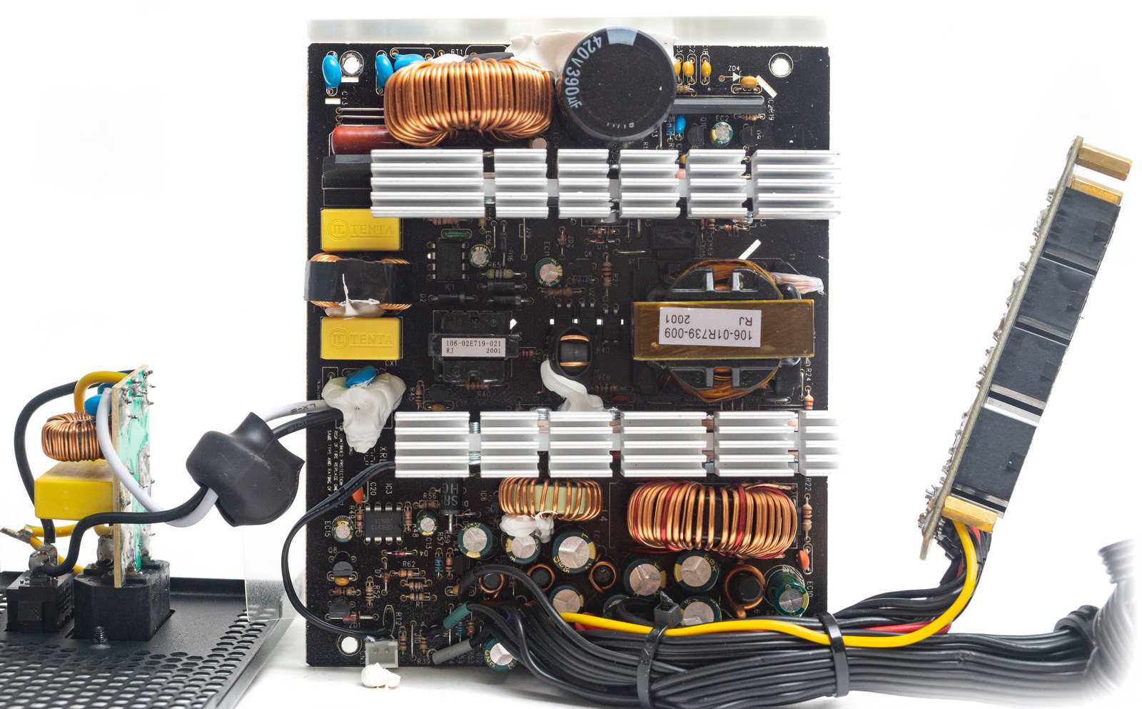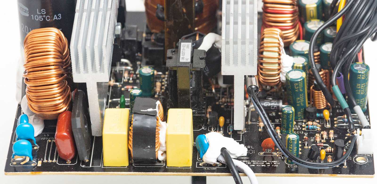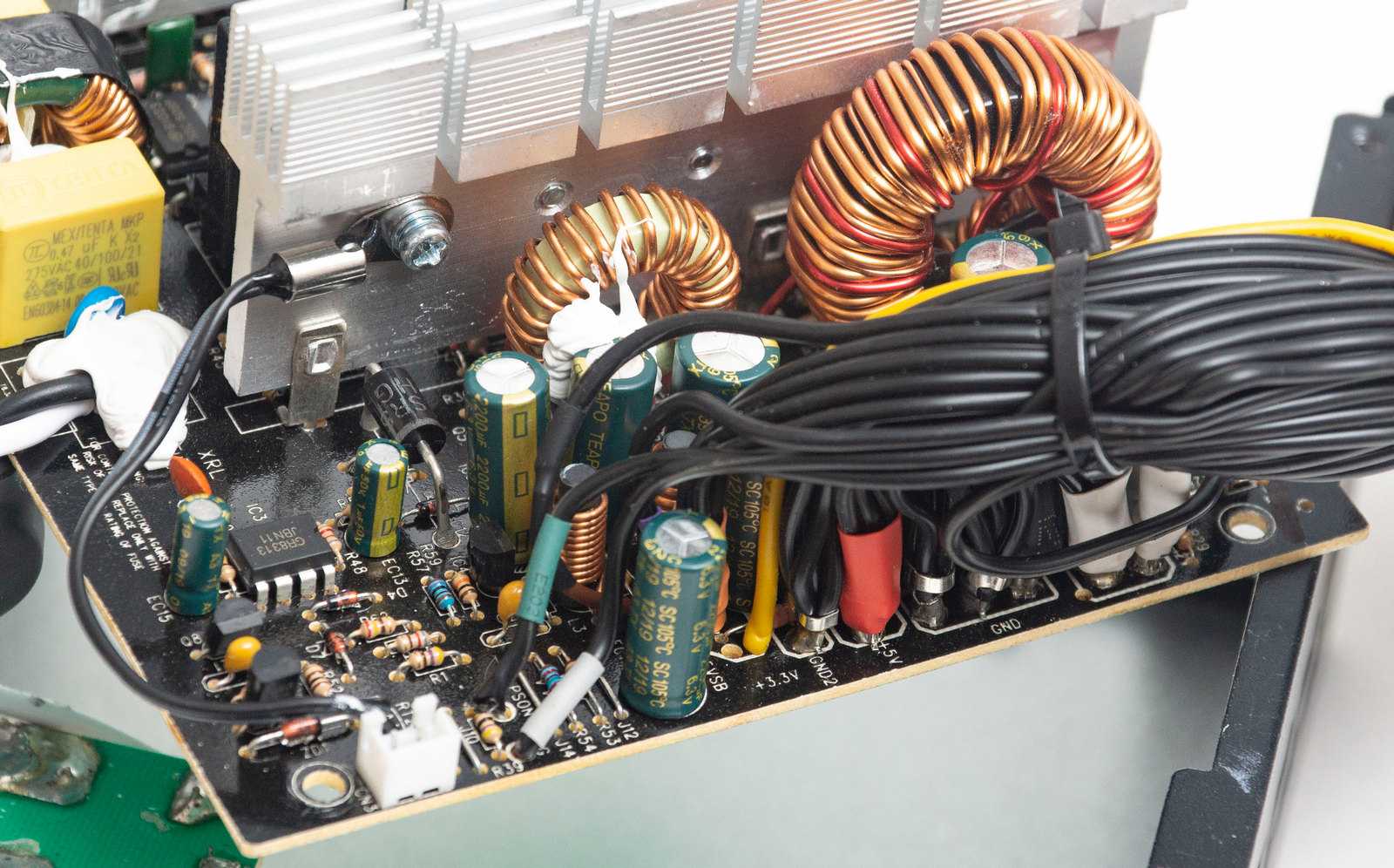Экономия нам видится за счет групповой стабилизации и отсутствия проводов калибра 16AWG на особо нагружаемых линиях. Из плюсов: конденсаторы Teapo, хороший фильтр, качественные компоненты схемотехники. Напряжения находятся в пределах стандарта, но колебания довольно значительные от +4% до -3% по вторичным линиям, что для современного БП довольно большой разброс.