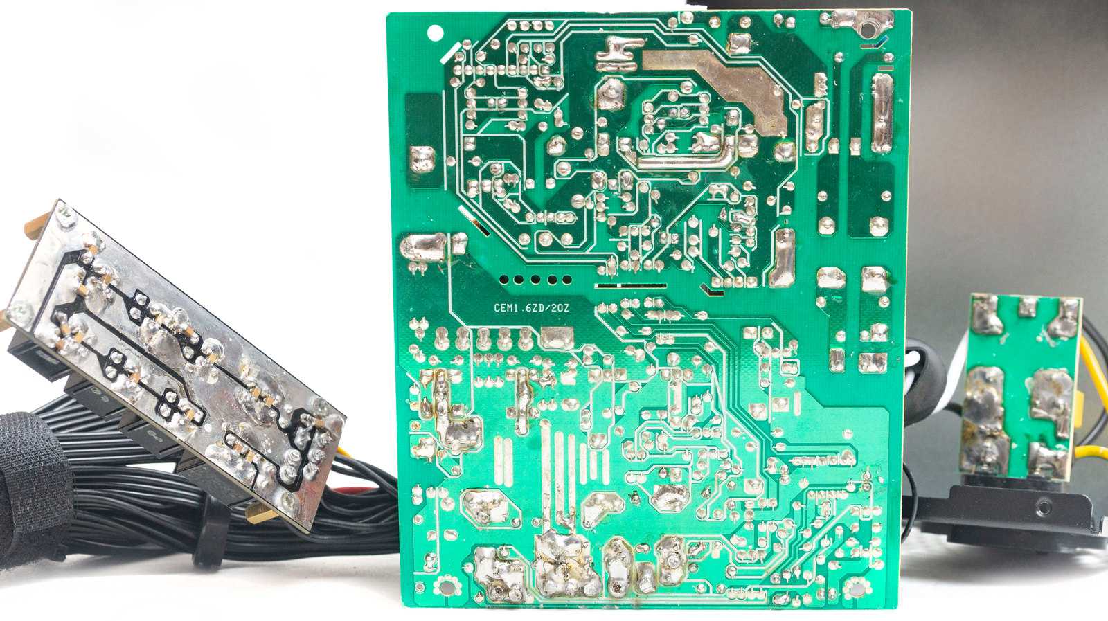 Вскрыв корпус, сразу видим основания снижения стоимости изделия: групповая стабилизация напряжения, от которой отказываются производители даже в бюджетных решениях; но, с другой стороны, её также можно встретить и в более дорогих моделях. Плата с коннекторами для модульных кабелей соединяется с основной платой проводами и не несет на себе никаких фильтрующих конденсаторов. Основной трансформатор выглядит очень маленьким для групповой стабилизации, как и высоковольтный конденсатор.