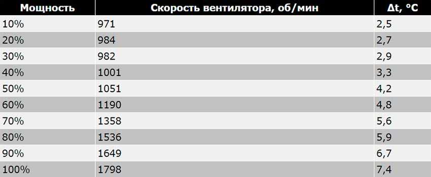 За охлаждение всей системы отвечает 140-милиметровый вентилятор (характеристики в документации не прописаны). В плане конструкции он стандартен, а вот визуально имеет две особенности (логотип HIPER и фиолетовый цвет крыльчатки). На старте число оборотов достигает тысячи в минуту, на максимуме – около 1800. Зависимость количества оборотов от мощности представлена на изображении.