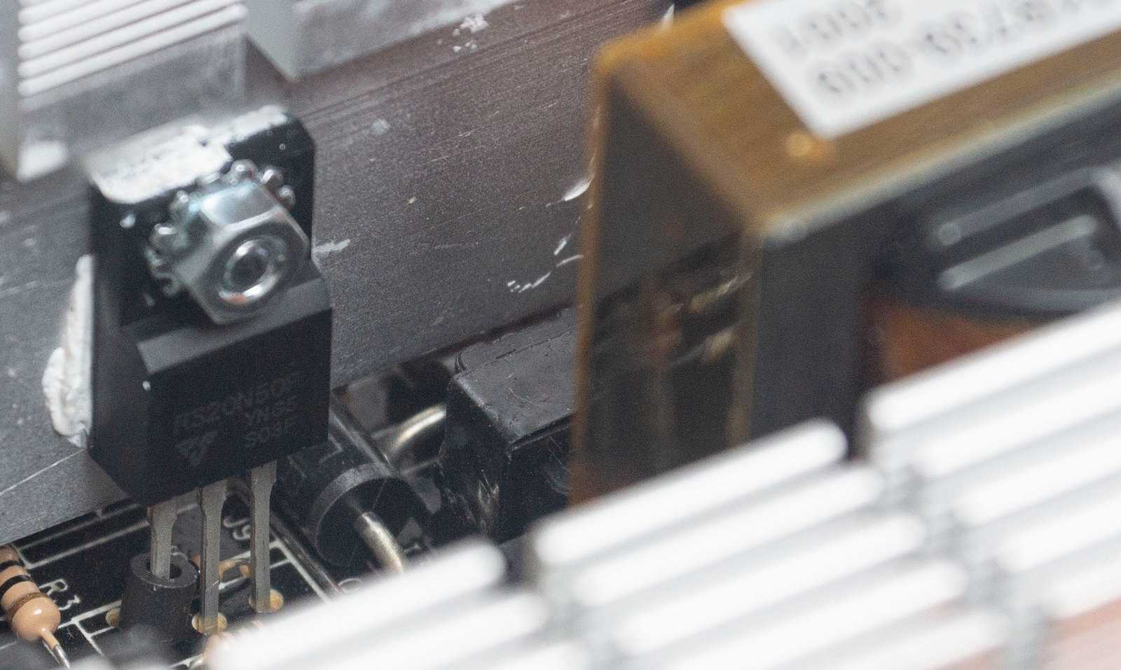 Рядом два дросселя: крупный — для каналов +5 В и +12 В, меньший — для канала +3,3 В. К радиатору крепиться термистор из схемы регулировки оборотов вентилятора.