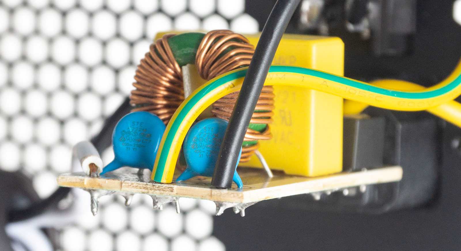 На входной розетке прикручена плата с первым звеном EMI-фильтра в виде двух Y-конденсаторов, одного X-конденсатора и дросселя, плюс ферритовое кольцо на проводах.