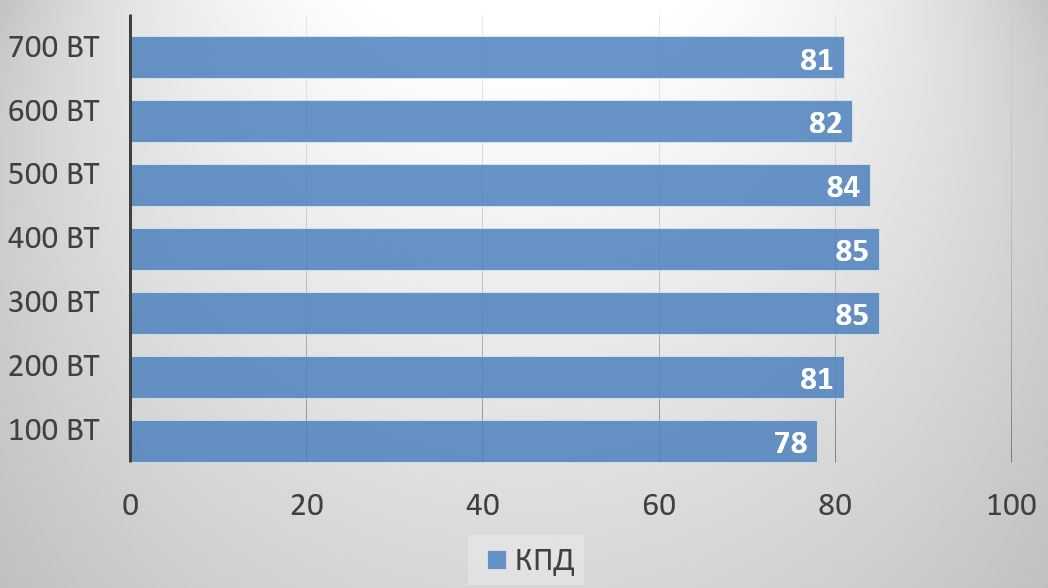 Показатель эффективности хороший. Модель сертифицирована, а максимальные 85% вполне укладываются в стандарт 80 PLUS для напряжения 230 В, на 100 Вт нагрузке КПД менее 80%.