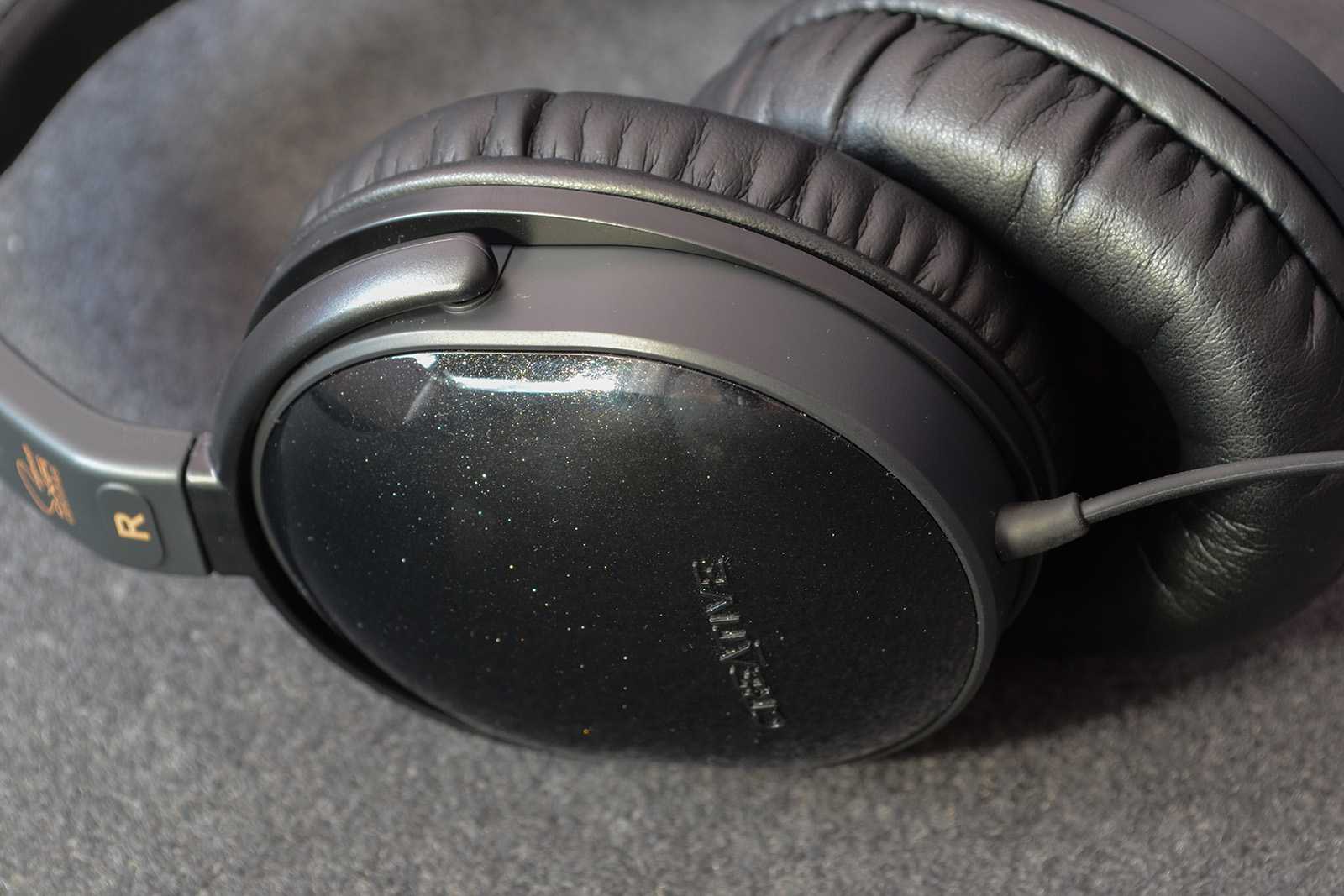 Чаши глянцевые с пластиком «гламурного» окраса. Ну то есть это чёрный пластик, выглядящий так будто его обсыпали очень мелкой тёмной но бликующей металлической стружкой или просто блёстками, а затем этот слой пластика поместили под очень тонкий слой прозрачного. Рядом проставочные матовые кольца. Внутри золотистой краской обозначены левый и правый наушники в дополнение к буквам «L» и «R» на дужке.