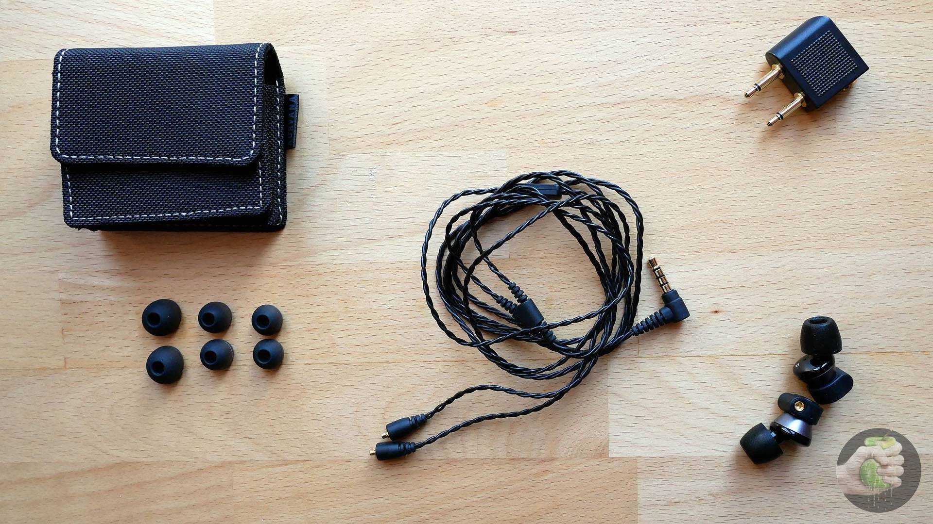 Помимо наушников, сменных амбушюр и чехла для переноски в комплекте идёт коннектор для подключения наушников к мультимедийной системе в самолётах:
