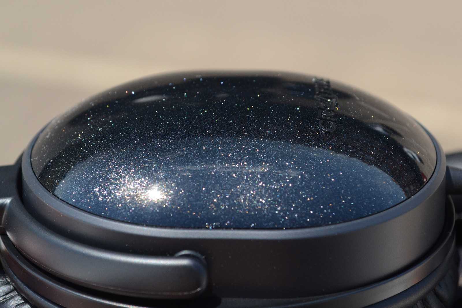 Практически всю площадь чаши занимает вставка, которая является изюминкой внешнего вида наушников. Вставка имеет глубокий, многослойный окрас с блестками внутри. Напоминает глубокий металлик, покрытый несколькими слоями лака и отполированный до крайней формы прозрачности.