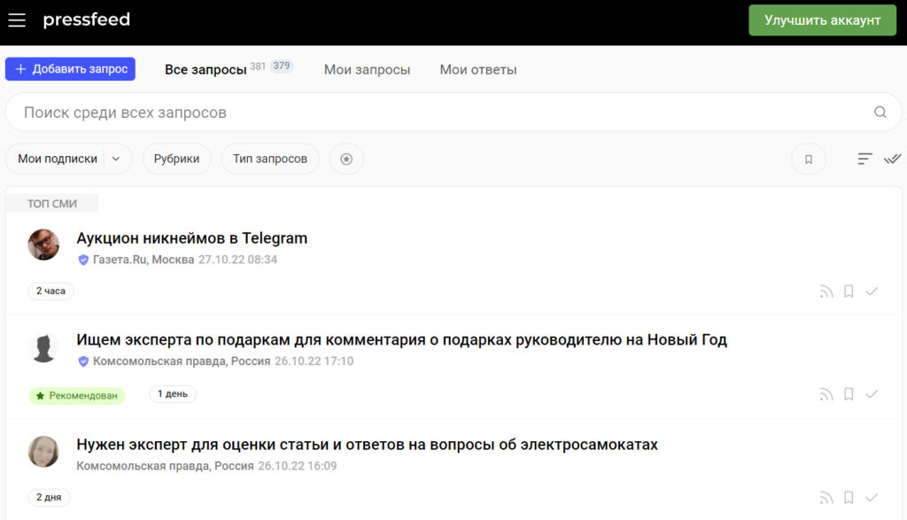 Связываться с ними можно напрямую, но гораздо удобнее — через сервис Pressfeed. Здесь в реальном времени появляются сотни актуальных запросов от ведущих СМИ и блогов. Для ответа достаточно подготовить текст и нажать две кнопки.