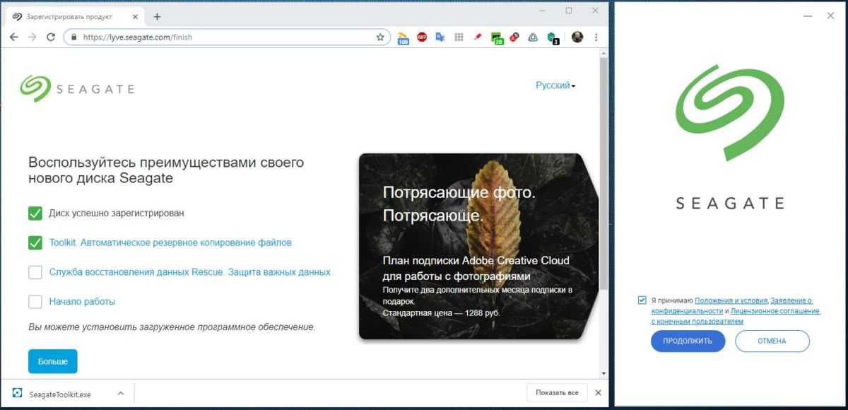 На следующем шаге вам будет предложено загрузить и установить программу Seagate Toolkit и приложение Mylio (в комплекте подписка на год) для агрегации фотографий со всех онлайн-сервисов в одну систематизированную библиотеку. Людям, которые ведут мобильный образ жизни и много фотографируют такая штука может оказаться очень полезной. Тем, кто занимается профессиональной обработкой фото придется по вкусу еще один бону — два месяца бесплатной подписки на Adobe Creative Cloud.