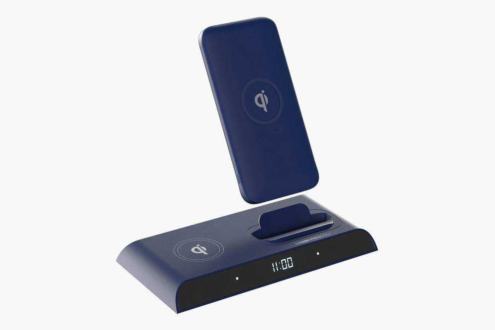 Более простой вариант «подставки под телефон с беспроводной зарядкой». На док-станции гаджет заряжается только в стоячем положении, через пауэрбанк — беспроводным путем. Габариты пауэрбанка очень близки к модели выше.
