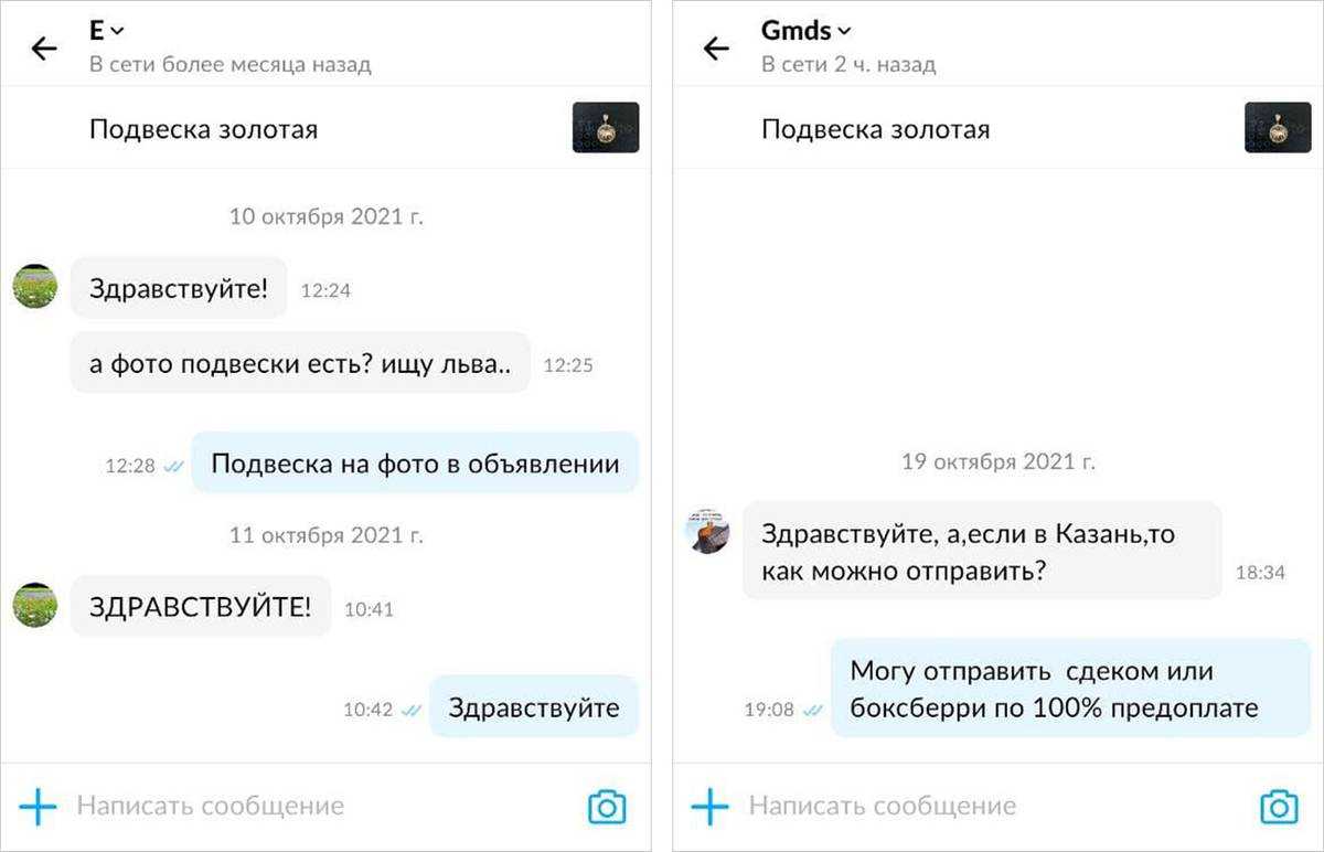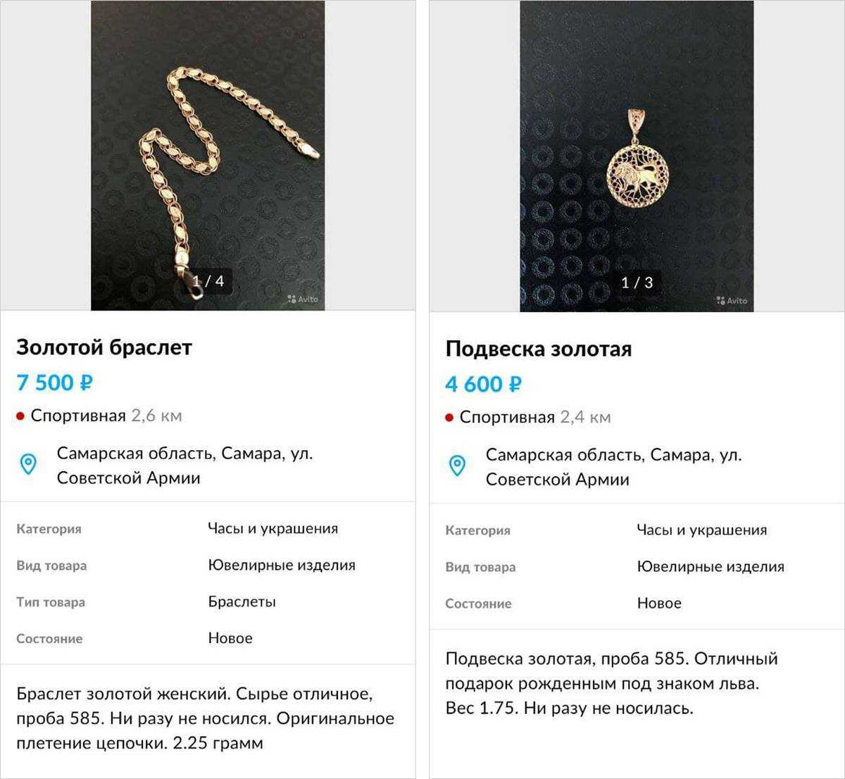 В августе 2021 года, одновременно с объявлениями на барахолках, я разместила шесть объявлений и на «Авито». Указала в них те же цены и добавила такие же фото, но расширила описания: кроме характеристик (вес, размер, проба), добавила небольшие примечания вроде «Кулон — отличный подарок родившимся под знаком Льва».
