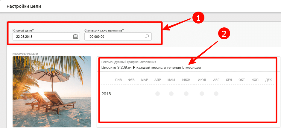 Настройка кошелька происходит по клику на кнопку «настройка цели». Владелец вводит дату завершения накопления и желаемую сумму (1). Система производит расчёт и выводит график рекомендованных ежемесячных платежей(2). Если клиент в какой-то из месяцев не вносит рекомендуемую сумму, система производит перерасчёт и выводит на экран новый рекомендованный ежемесячный взнос.