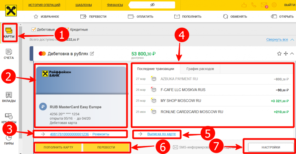 Для управления собственными картами и дополнительными (открытыми для близких) необходимо зайти в раздел «Карты» (1). На экране отобразится вся информация о самой карте (2), её реквизитах (3), проведённых транзакциях (4). При необходимости клиент может получить подробную выписку по карточке (5), перевести средства, пополнить счёт (6). Возможности персональной страницы позволяют самостоятельно выполнить настройку её возможностей (7).