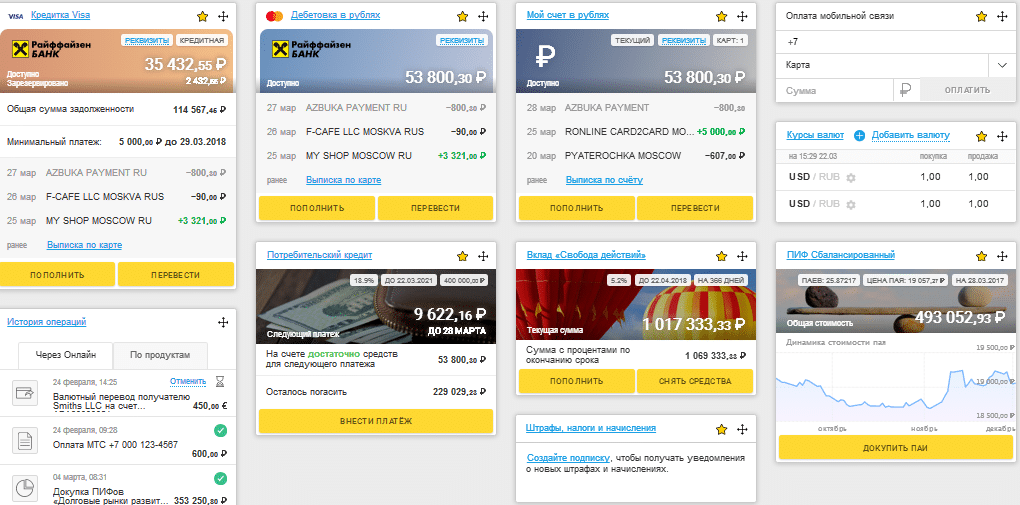 Платежи и переводы• быстрые переводы между счетами, внутри банка и в другие банки• удобные переводы с карты на карту• бесплатное пополнение карт Райффайзенбанка с карт других банков• переводы другим клиентам Райффайзенбанка по номеру телефона/карты• оплата различных услуг (мобильная связь, интернет, ТВ) — без комиссии