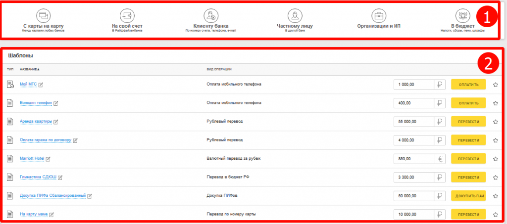 - Перевод между клиентами Райффайзенбанка по номеру телефона или адресу электронной почты;