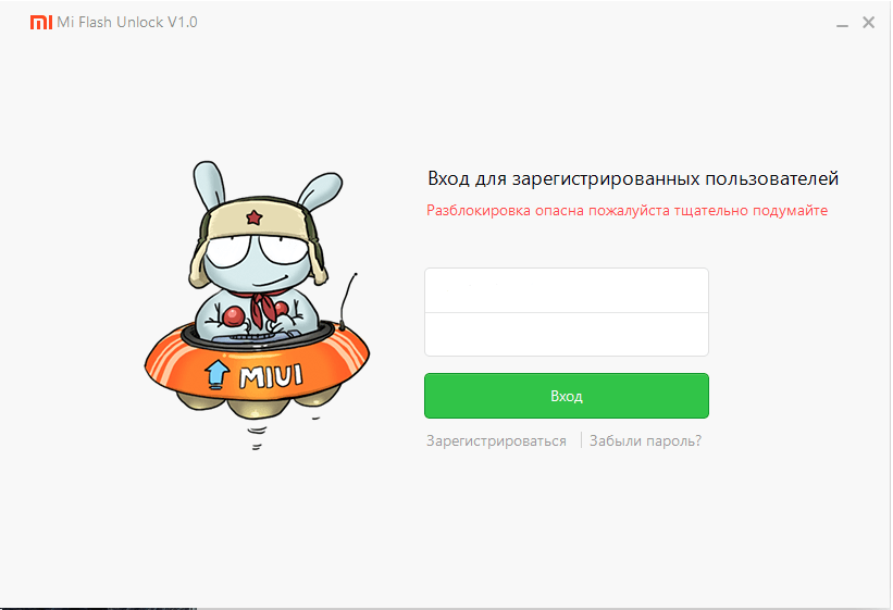 5. Скачайте на ваш компьютер программу Mi Flash Unlock (она же Mi Unlock), если у вас Windows, либо неофициальную версию Mi Unlock Tool для устройств на базе Linux / Mac. 6. Распакуйте программу (желательно в корень диска C:, если Windows). 7. На телефоне необходимо войти в FastBoot-режим. Для этого нужно сначала выключить, а потом включить смартфон, предварительно зажав кнопку питания и уменьшения громкости до тех пор, пока не появится окошко с надписью FASTBOOT и изображением зайца, который чинит робота. 8. Подключите смартфон к компьютеру через USB-кабель. 9. Запустите Mi Flash Unlock (Mi Unlock Tool) на компьютере. Появится экран логина — введите свои данные от аккаунта. Если не помогает ввод телефона, попробуйте ввести номер учетной записи.