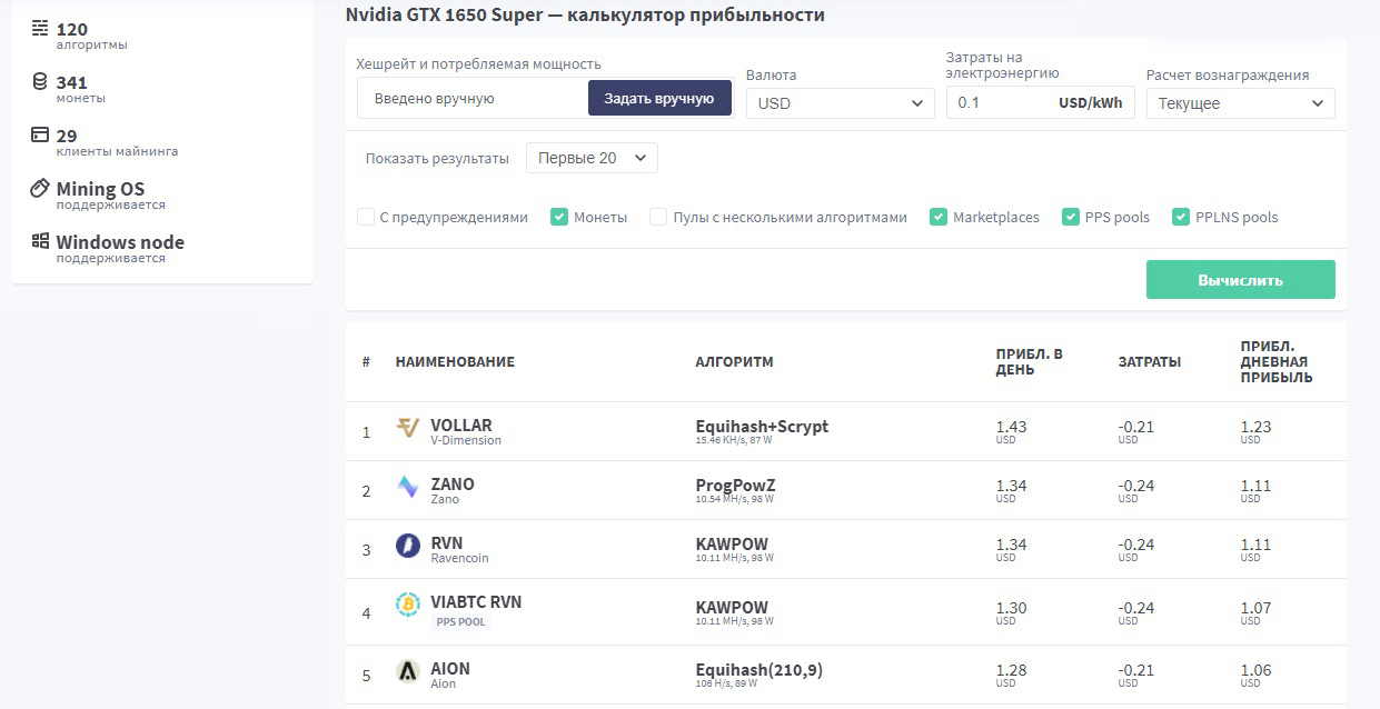 Итак, смотрим какой сможет принести доход майнинг на 1650 SUPER.
