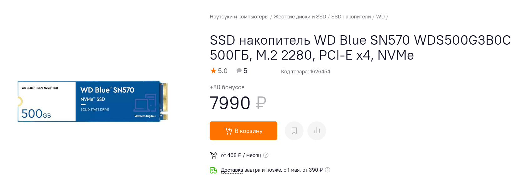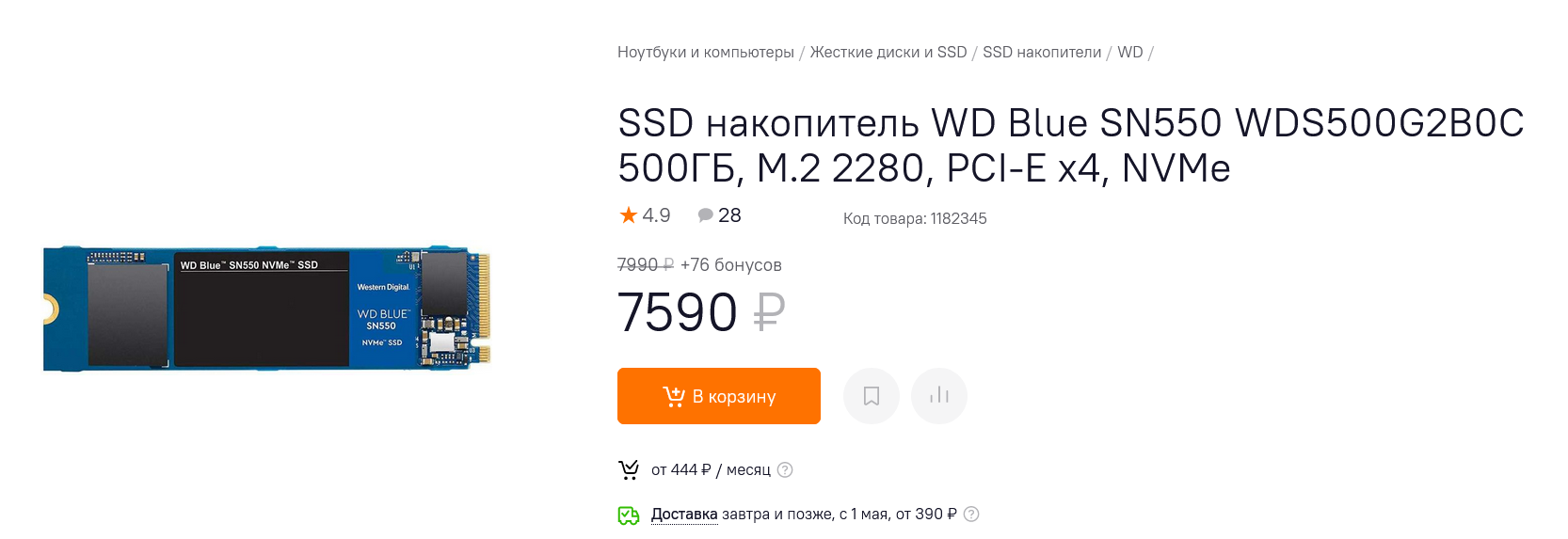 Поэтому, если вы хотите реально ускорить свою систему, то стоит сразу покупать быстрые M.2 SSD, например, WD Blue SN550 WDS500G2B0C в Ситилинке.