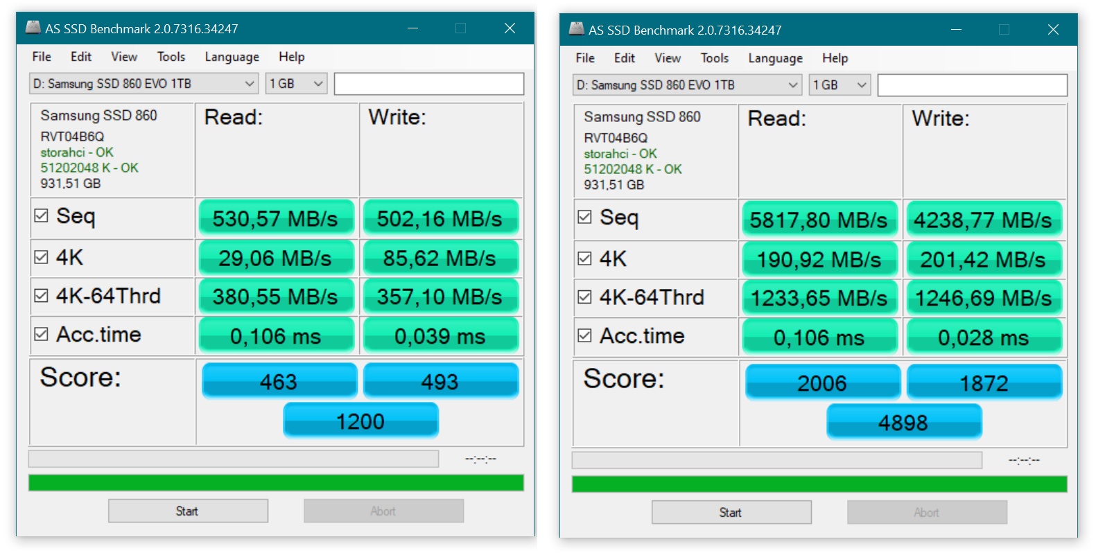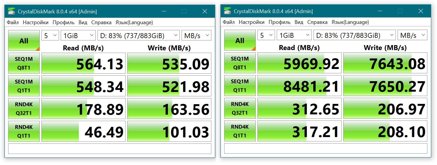 Результаты впечатляют и создают ощущение, что в системе установлен быстрый M.2 SSD с интерфейсом PCI Express. Увеличение скорости достигает 10 раз и более.