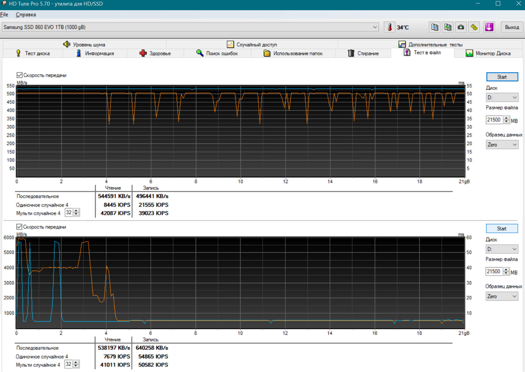 Еще один показательный тест SSD можно сделать с помощью утилиты HD Tune Pro, выбрав режим тестирования с большим файлом, размер которого я установил в 21500 МБ. На скриншоте хорошо заметно, как подскочила скорость при работе с первыми 4 ГБ файла, которые уместились в кеш, расположенный в ОЗУ.