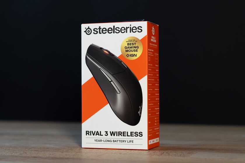 Мышка SteelSeries Rival 3 упакована в яркую бело оранжевую картонную коробку компактного размера. На передней стороне изображение SteelSeries Rival 3 и золотая надпись “Выбор IGN среди игровых мышек”.
