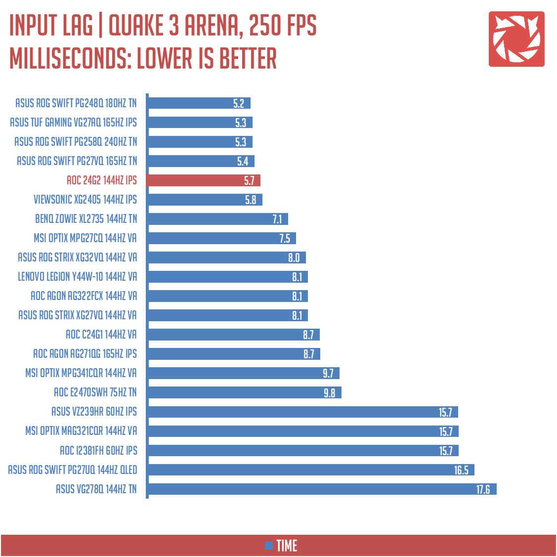 The input lag test result shows that the AOC 24G2 has an average latency of 5.7 ms. The new 5th fastest overall and the 2nd fastest IPS based monitor we’ve tested so far, taking the crown from the ViewSonic model.