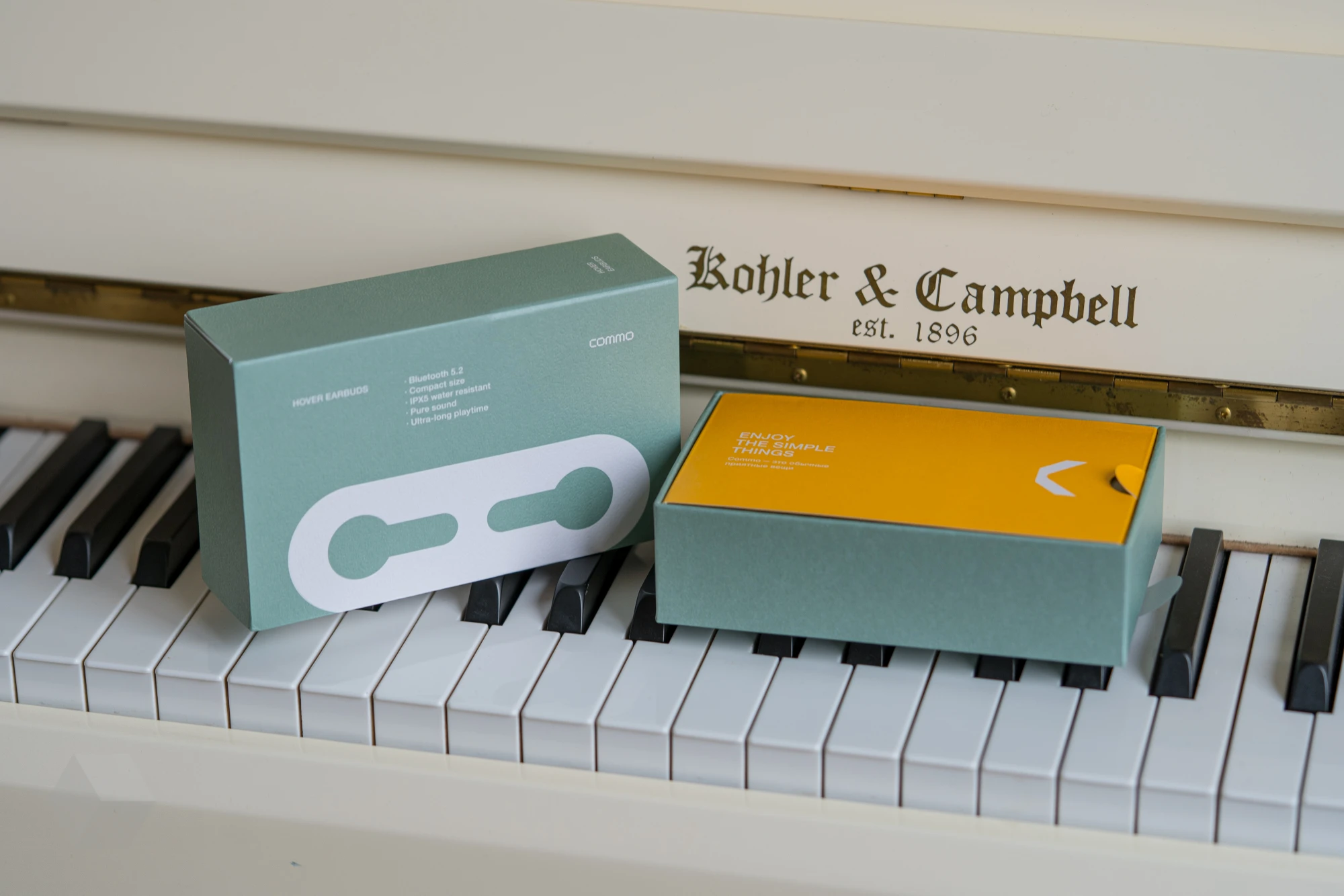 Внутри лежит жёлтый конвертик с документацией. Цветовое оформление как наушников, так и коробки выполнено в фирменном стиле Commo — что-то между тёмно-зелёным и серым цветом. Мы на обзор взяли серую версию, но есть и светлая, а точнее «молочная».