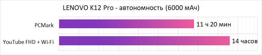 А вот автономность у LENOVO K12 Pro на практике оказалась отличной – без преувеличения, это один из самых долгоживущих смартфонов на рынке, причём не только в бюджетном сегменте. Тест PCMark протянул целых 11 с лишним часов, что является очень высоким результатом. При просмотре видео с включенным Wi-Fi можно смело рассчитывать на 14 часов работы. Понятно, что в режиме ожидания или экономном смартфон легко может прожить около недели. При стандартном повседневном сценарии использования батареи должно хватать на два дня, как минимум.