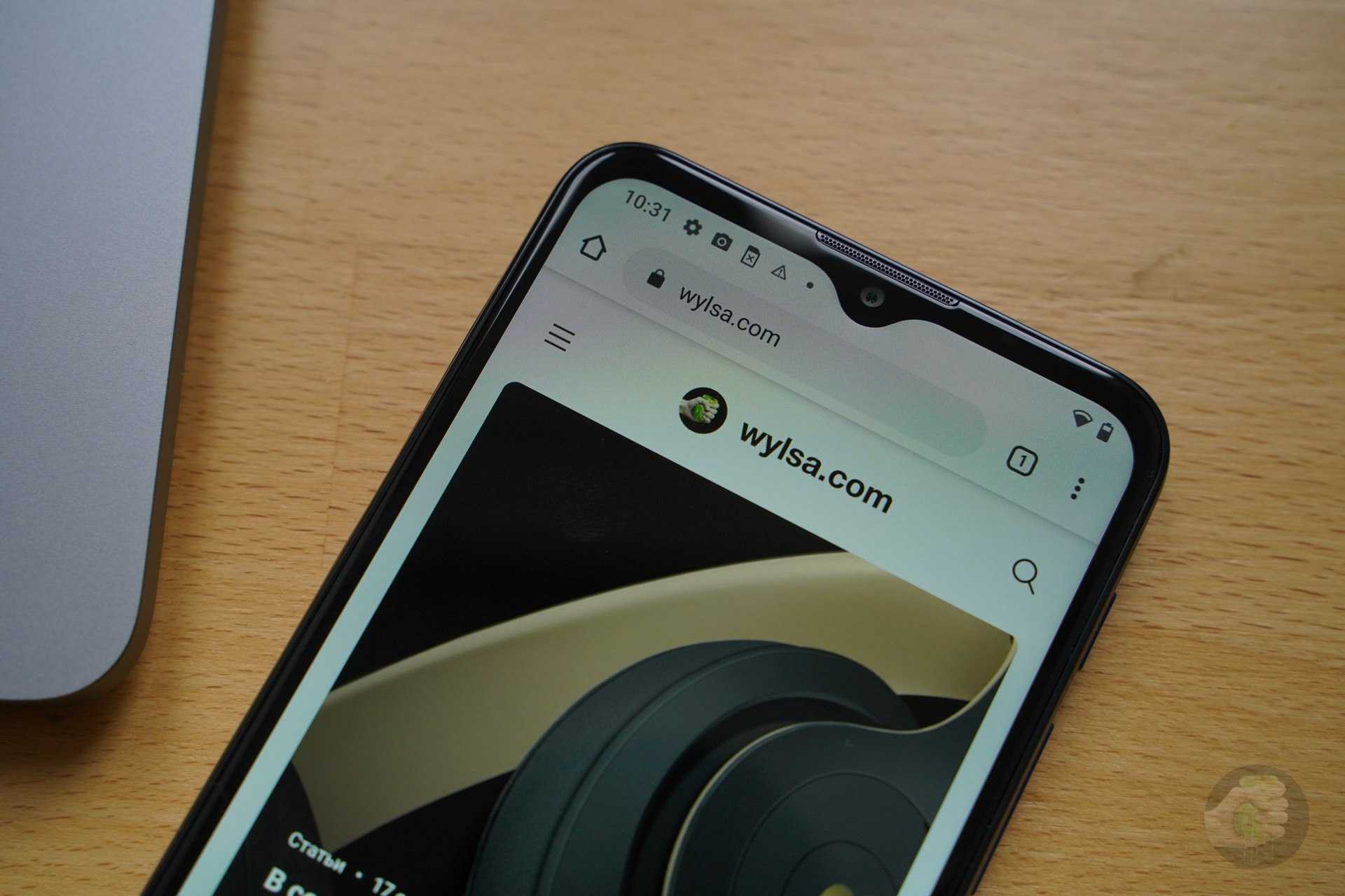 В плане экстерьера герой обзора является типичным смартфоном второй половины 2020 года. У него аккуратный каплевидный вырез под фронталку, а также достаточно крупный подбородок. Отметим, что и рамки по бокам тут не самые тонкие в сегменте.