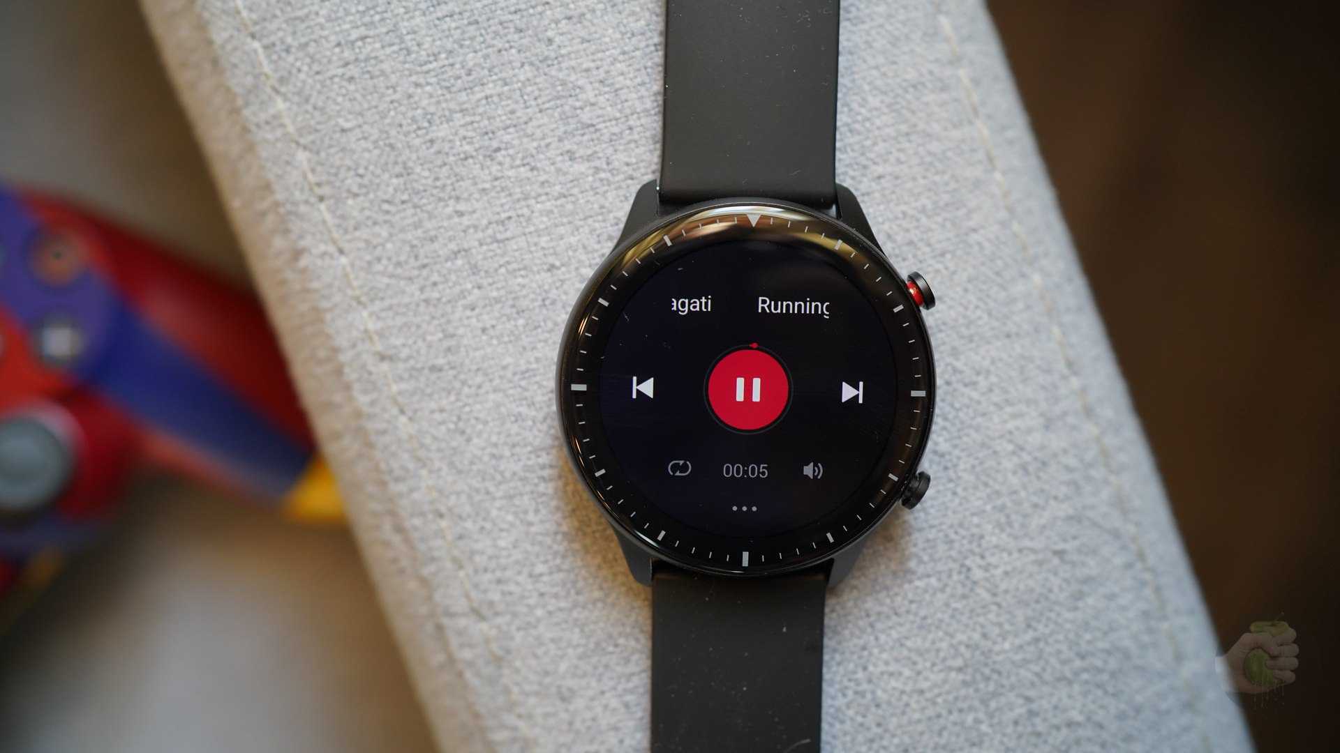 Часы работают в качестве пульта для управления музыкой на телефоне, есть будильник и прогноз погоды. Музыку можно слушать и автономно, не подключаясь к телефону, благодаря встроенным 3 ГБ памяти. Остаётся лишь взять Bluetooth-наушники — например, родные PowerBuds, — подключить их к часам, загрузить в Amazfit GTR 2 сотни три песен и отправиться на тренировку.