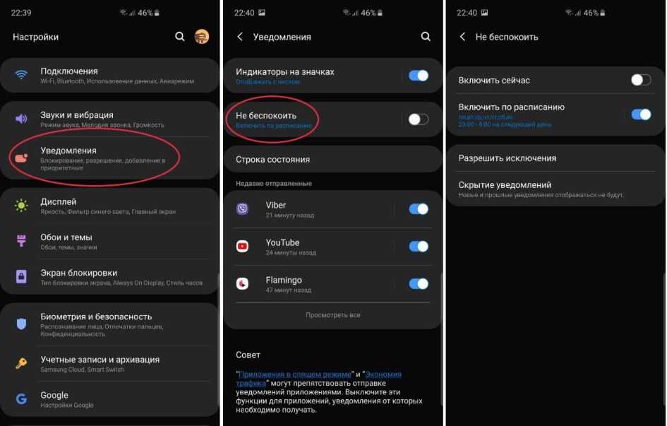 Для настройки опции в телефонах самсунг нужно войти в «Настройки» и выбрать меню «Уведомления», где будет отображаться опция «Не беспокоить».