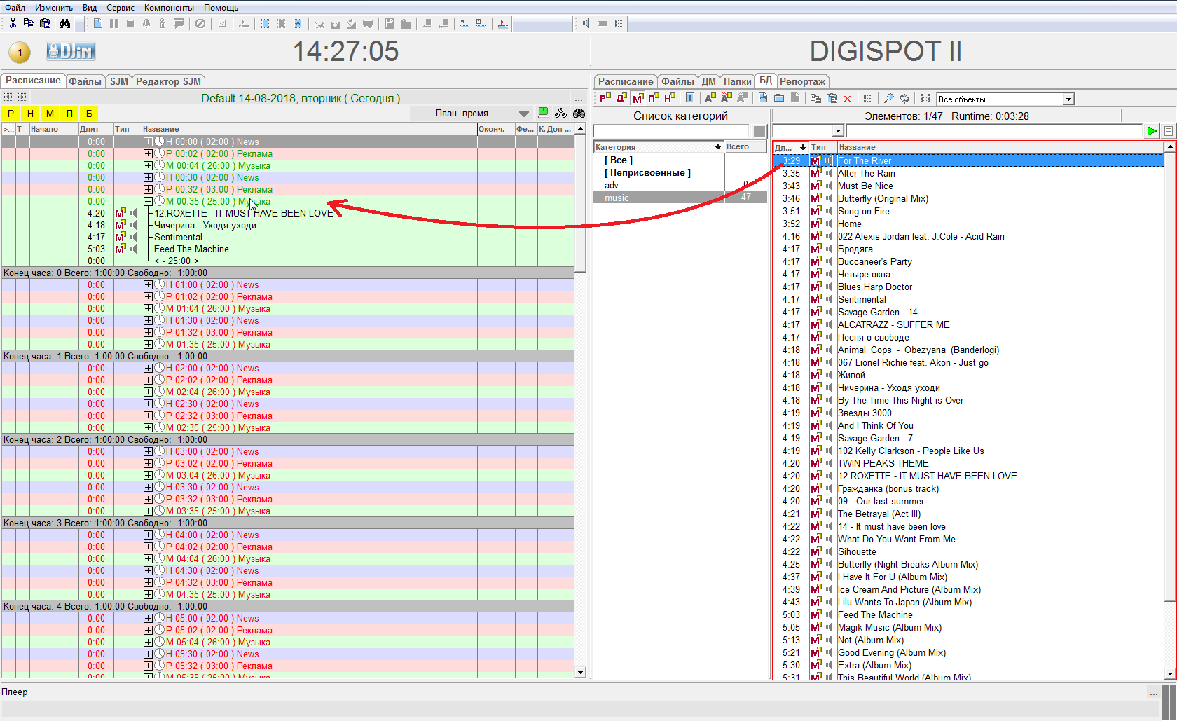 Для заполнения расписания звуковыми элементами откройте модуль Файлы или БД и перетащите мышкой необходимые элементы в подходящие блоки.