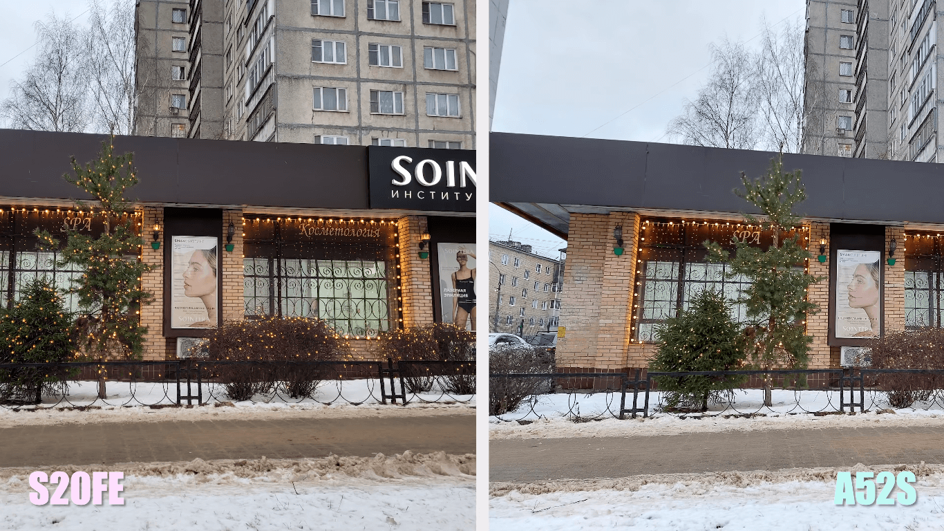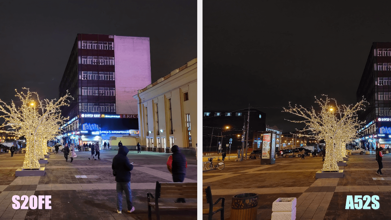 Samsung Galaxy S20 FE При хорошем освещении оба смартфона фотографируют плюс-минус одинаково. Однако при слабом свете S20 FE демонстрирует гораздо лушую детализацию, хотя и сильнее при этом шумит.