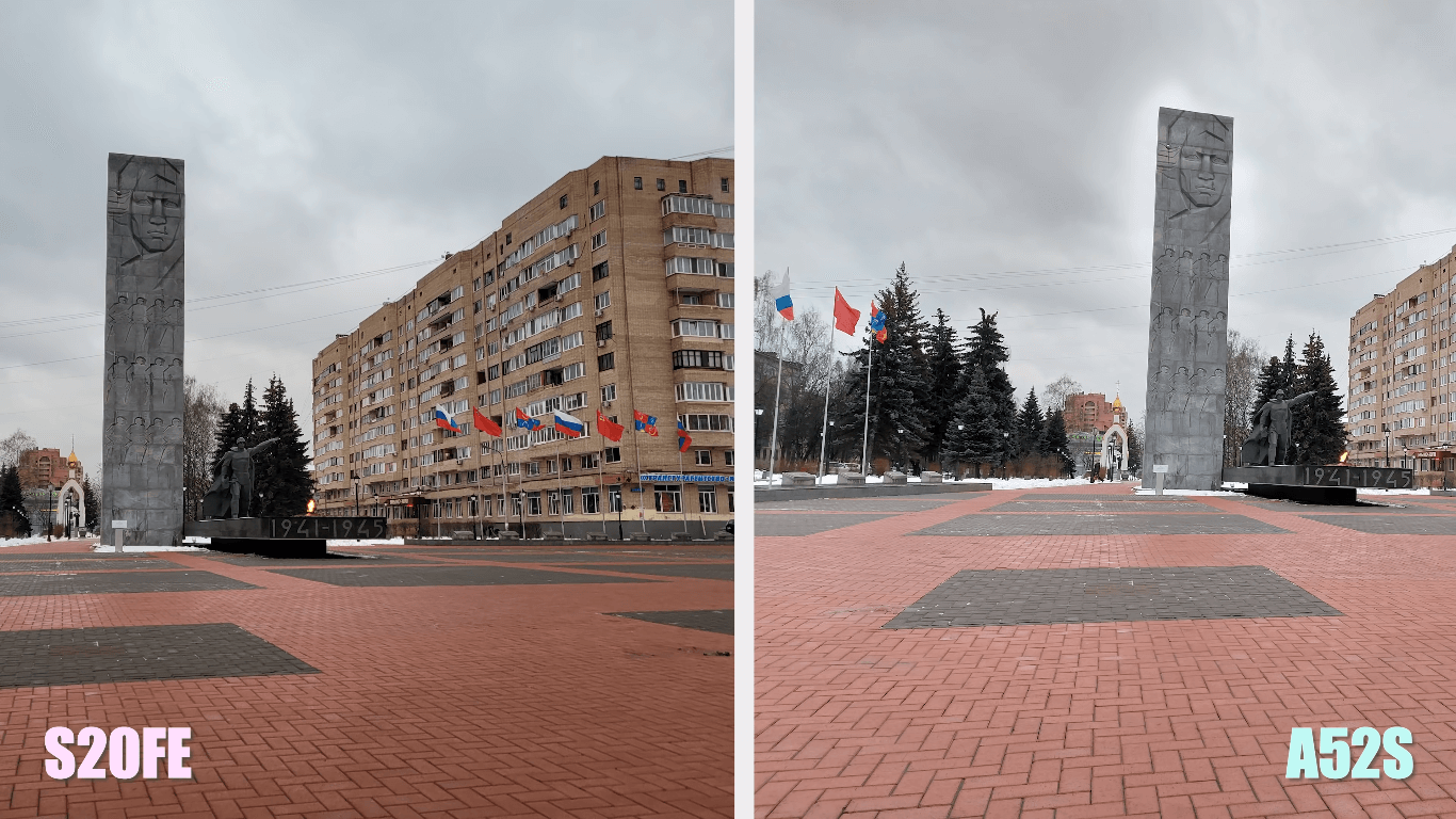 Характеристики камер также различаются. На A52 стоит 64 Мп камера с OIS и диафрагмой f/1.8. На Samsung S20 FE сенор такого же размера — 1/1.76 дюйма, но с разрешением 12 Мп. OIS тоже есть — куда же без него в телефона уровня флагмана. Также на Samsung S20 FE есть телефото камера с 3-кратным оптическим зумом, чего нет на Galaxy A52