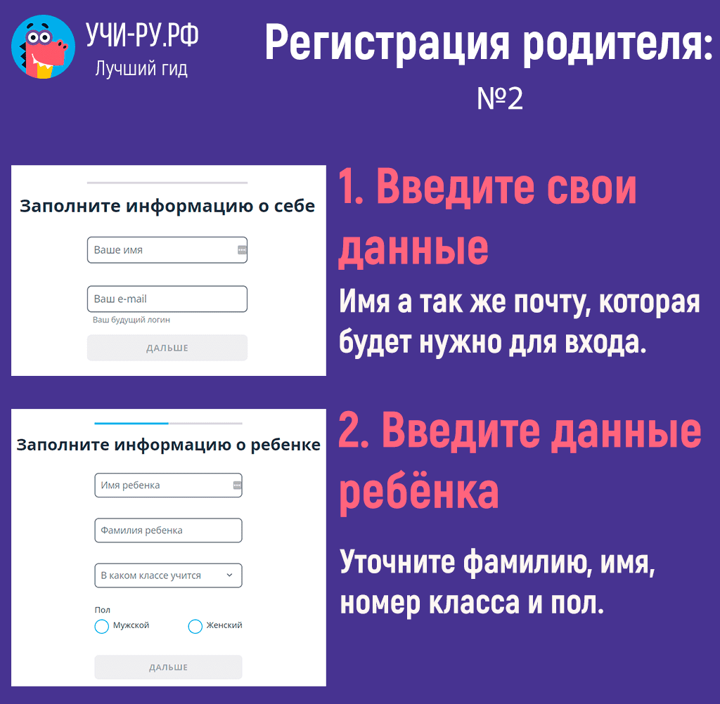 Родители предоставляют системе данные, создают свой профиль (личный кабинет) и связывают его с профилем ученика, далее у него доступны задачи, задания и он уже может приступить к получению знаний.