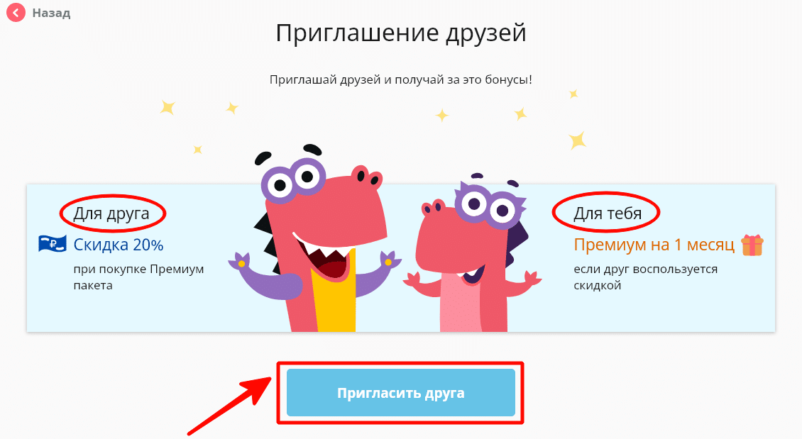 Именно в персональном кабинете учащегося можно получить бесплатный премиум-аккаунт. Выберите раздел «Пригласить друга» и получите ссылку-приглашение.