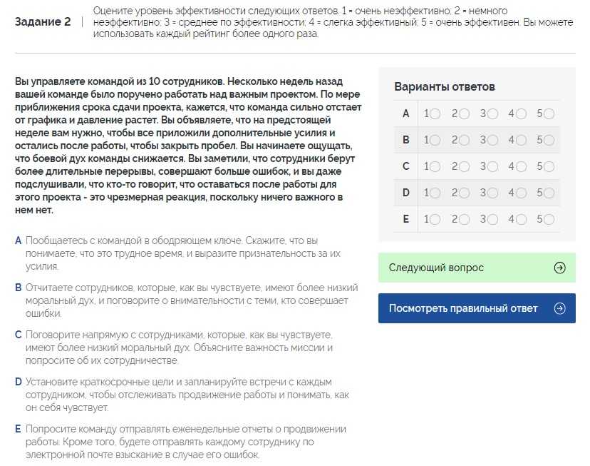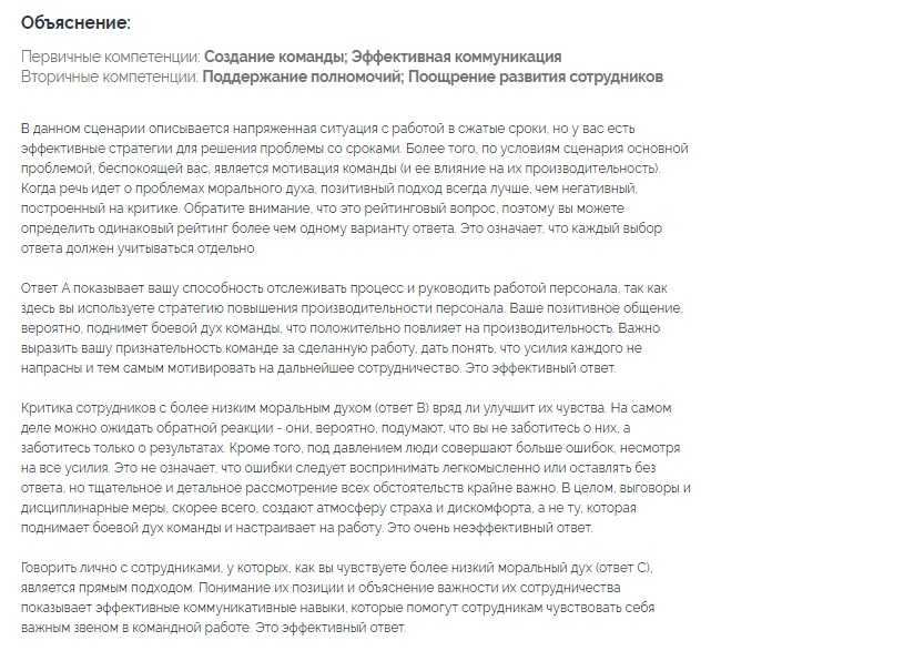 Наша рекомендация совершенно другая – глубоко анализировать каждый вопрос и ответ в плане того, какая компетенция в нем демонстрируется и оценивается. Понимание, какой гибкий навык оценивается в вопросе, и какой ответ лучше всего его демонстрирует – это ключ к успешной сдаче любого теста. Приведем пару примеров.