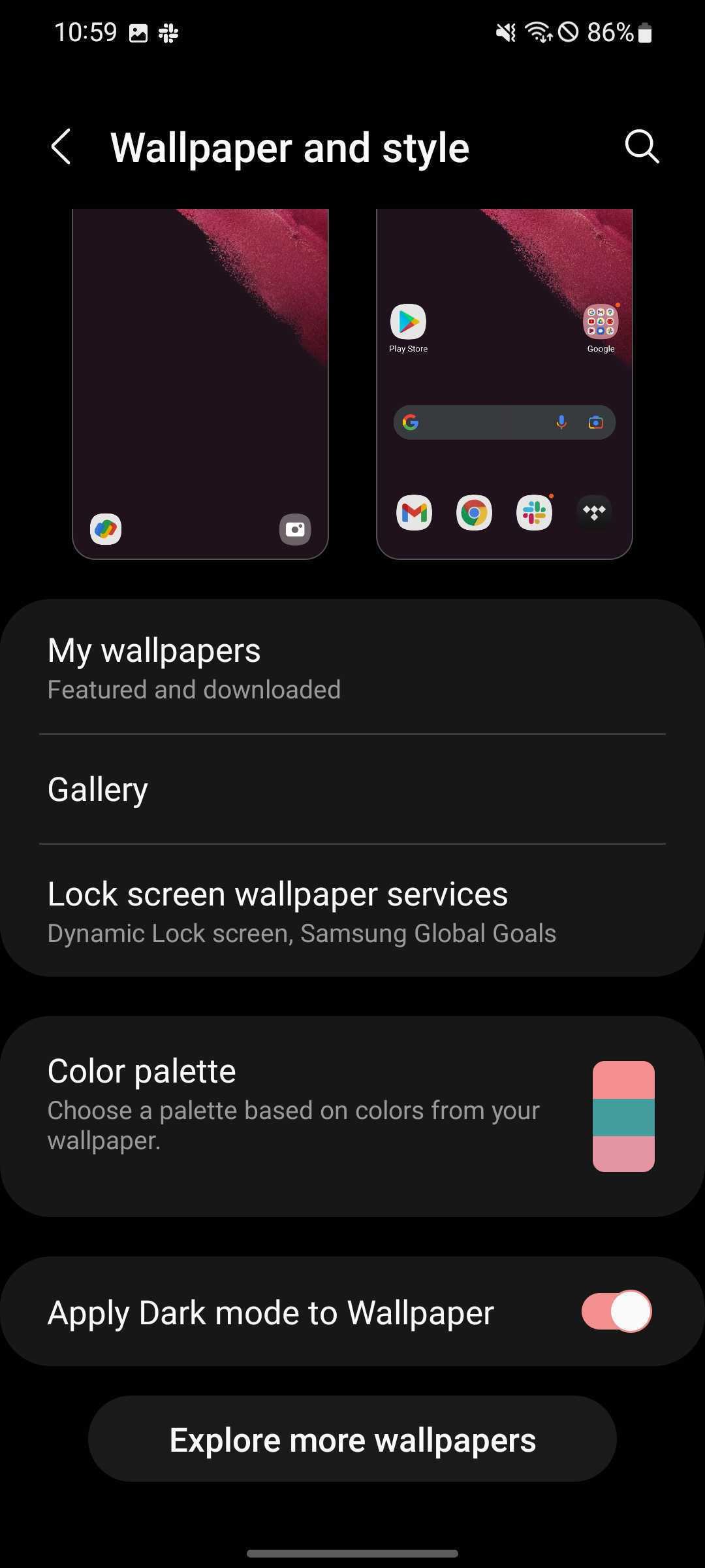 In order to choose a color palette, tap and hold on the homescreen again. This time, look for Color palette and tap it. This screen will show you different options depending on what color wallpaper you choose. One UI 4 usually gives you a few palettes to choose from. Go ahead and choose a color palette and watch the preview window at the top of the screen. Cycle through them until you find one that looks good.