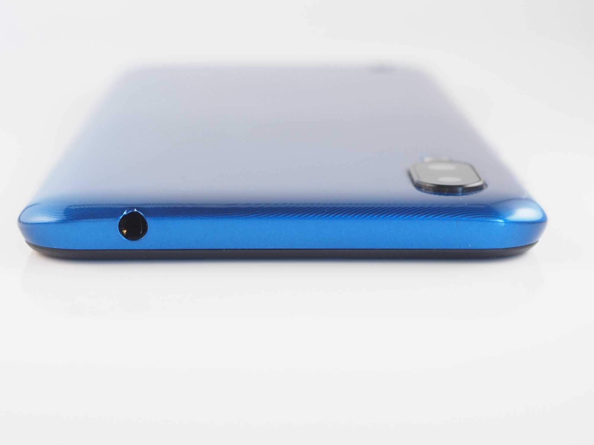 Задняя панель выполнена из глянцевого пластика синего цвета с текстурированным рисунком. Также ZTE Blade A5 2020 доступен в черном и зеленом цвете. На задней панели расположился блок из сдвоенной камеры со вспышкой и прорезь основного динамика. Задняя грань скругленная, за счет чего основной динамик хорошо слышно, даже если смартфон лежит на задней панели. ZTE Blade A5 2020 достаточно компактный смартфон, и он отлично лежит в ладони — не выскальзывает и не вызывает трудностей в управлении одной рукой. Но стоит заметить, что пластик задней панели достаточно маркий, и, если на синем цвете отпечатки пальцев не бросаются в глаза, то черный цвет не такой практичный, и на нем любой мусор и следы рук будут отчетливо выражены.
