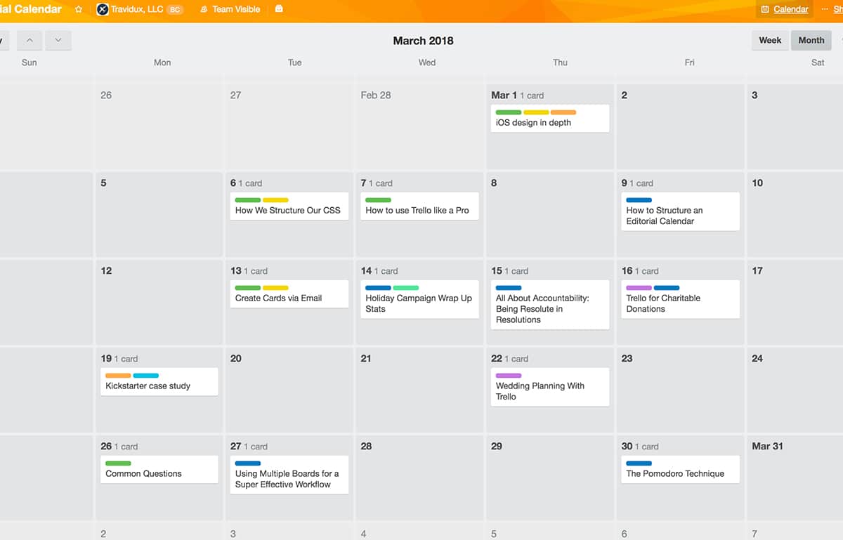 Календарь, который мы можем видеть в широком виде сверху решения Trello, чтобы мы могли с первого взгляда знать события, которые у нас есть на неделе. Бесплатное решение, которое позволяет нам назначить до 10 бесплатных досок для созданных рабочих групп в котором мы представляем участников студенческой группы или просто рабочего проекта.