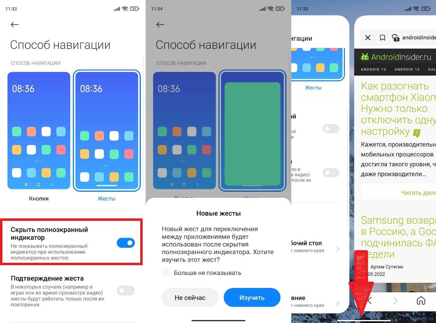 Полноэкранный индикатор удобен для переключения между запущенными приложениями, так как вам нужно просто смахнуть по нему влево или вправо. В то же время такой элемент интерфейса отъедает полезную площадь экрана. Функция подтверждения жеста помогает избежать ложных касаний в играх, когда зачастую пользователь неловким движением возвращается на рабочий стол.