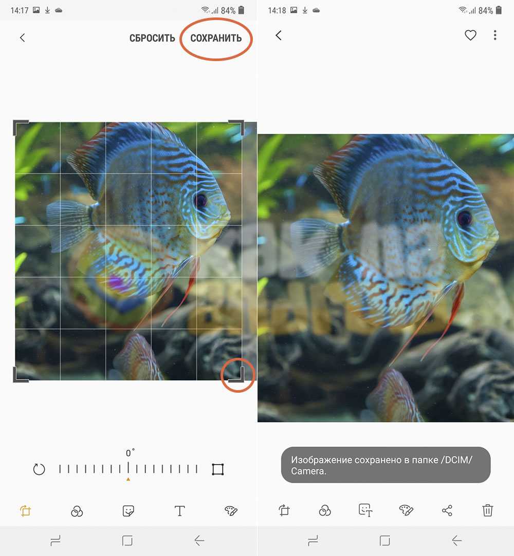 Редактор, представленный Samsung, очень полный. Вы можете вращать и обрезать фотографию, применять фильтры и наклейки, вставлять тексты, изменять цвета и интенсивность, переходя от карты к карте с помощью пяти значков внизу. Как только вы будете удовлетворены результатом, выберите Сохранить в правом верхнем углу!