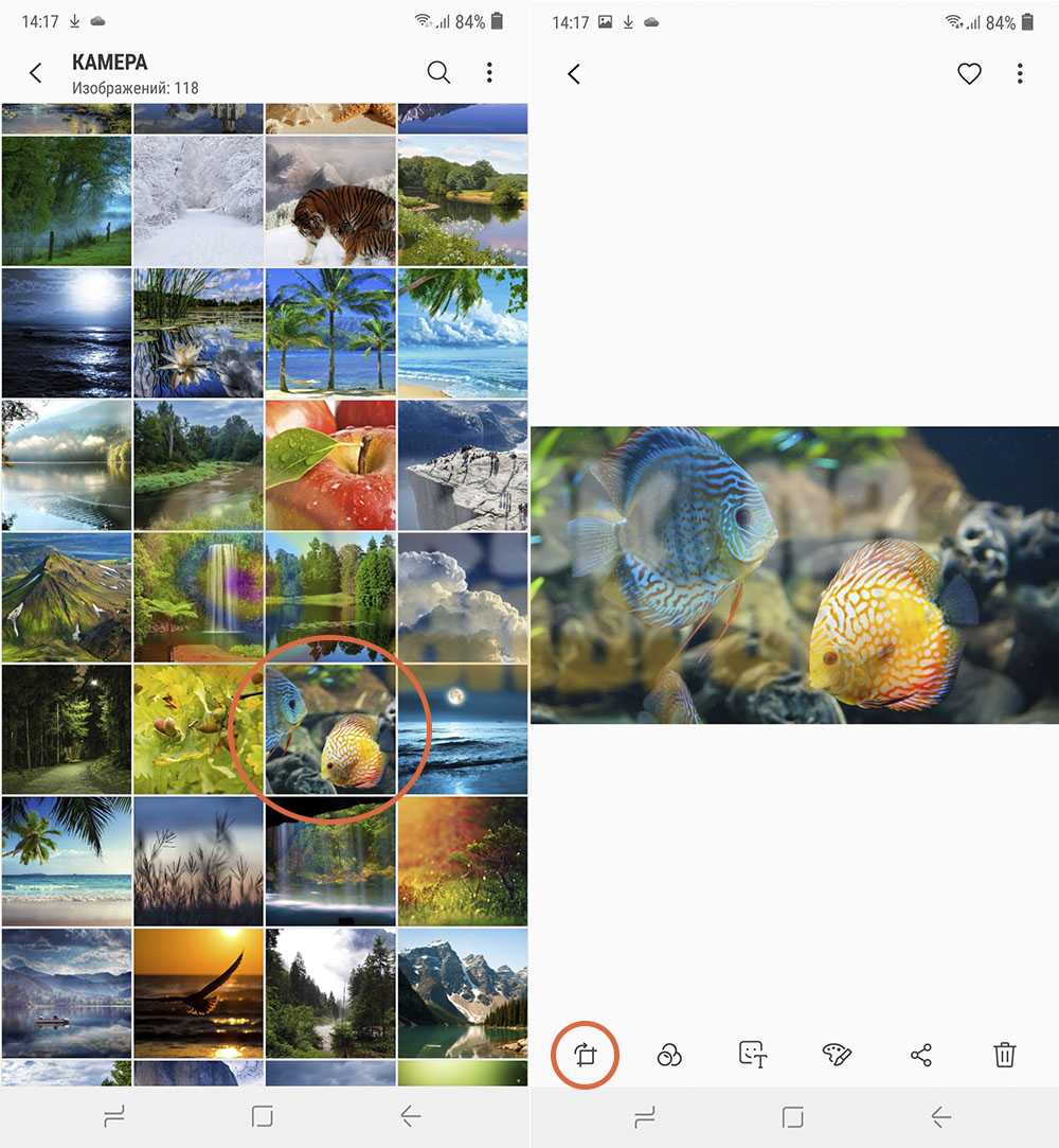 Открываем стандартное приложение “Галерея”, выбираем фото, которое необходимо обрезать, и в нижней части экрана нажимаем на иконку редактирования размеров и наклона фотографии.