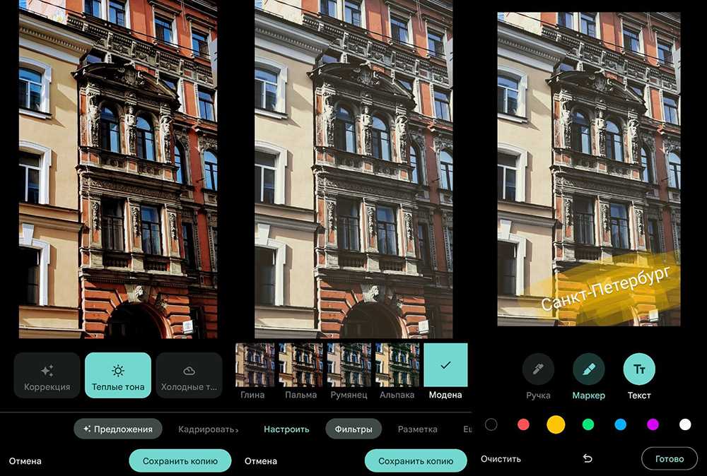 В приложении есть автоматические опции для быстрого улучшения освещения и цветов картинки: вы сможете указать предложенный ИИ профиль и сразу сохранить итог в галерею. Дополнительно можно произвольно кадрировать фото и убрать лишние части или подогнать снимок под определенные пропорции. Также есть возможность увеличивать резкость, рисовать поверх изображения и добавлять надписи.